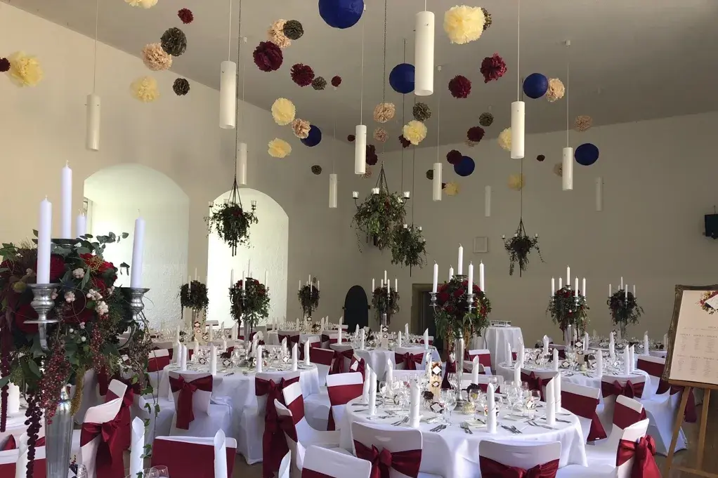 Gedeckte Hochzeitstafel in der ehemaligen Schlosskapelle.